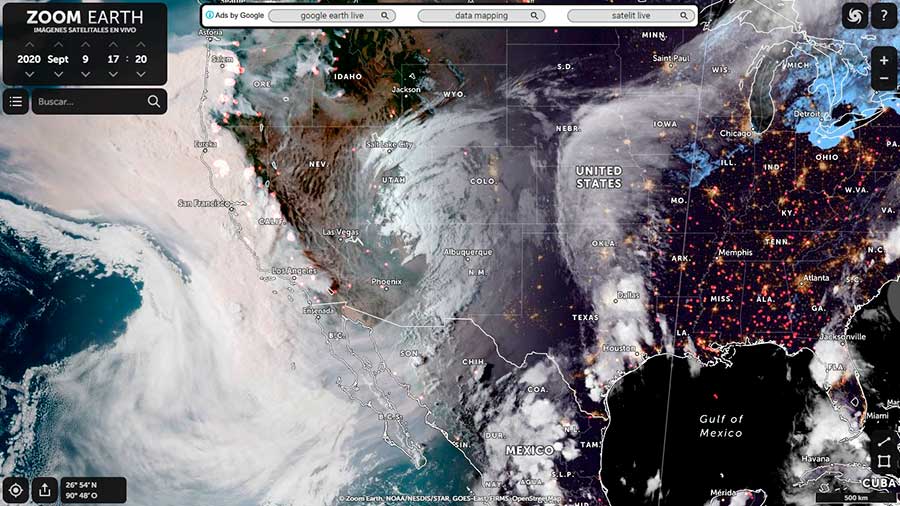 Por otra parte, una imagen compartida por la aplicación web Zoom Earth muestra que, hasta el día de hoy miércoles 9 de septiembre, los incendios forestales (marcados en rojo) continúan activos en California, y la nube de humo se ha internado cada vez más en México, particularmente en la península de Baja California y en Sonora.