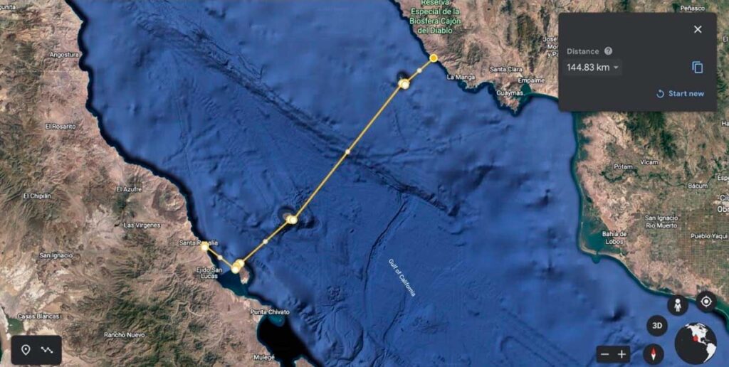 Cabe señalar que la parte del golfo de California por donde ella hace el viaje es una distancia superior que pasar entre la región de las grandes islas al centro del Golfo de California, también conocida como “la cintura del Mar de Cortés”, donde se encuentran las islas Tiburón, San Esteban y San Lorenzo, donde nunca dejas de ver tierra. En cambio, saliendo de isla Tortugas, la isla más oceánica de BCS en esa latitud, la distancia a isla San Pedro Nolasco en Sonora está a más de 55 millas náuticas, casi 100 km como se aprecia en la imagen de “Google Earth” anexa.