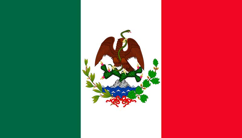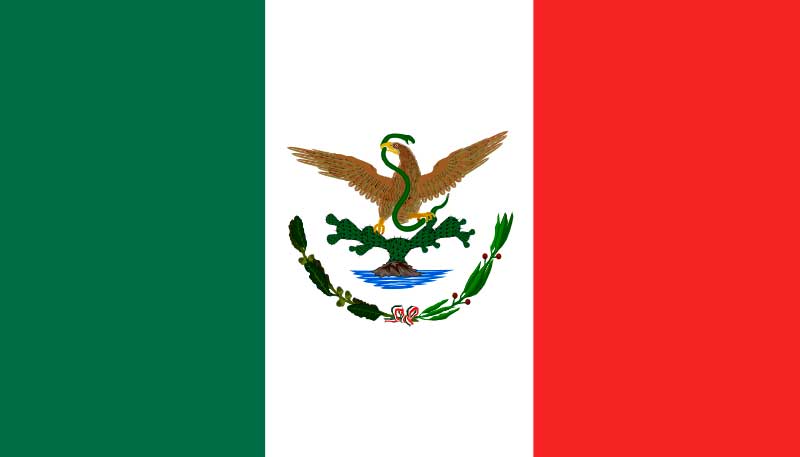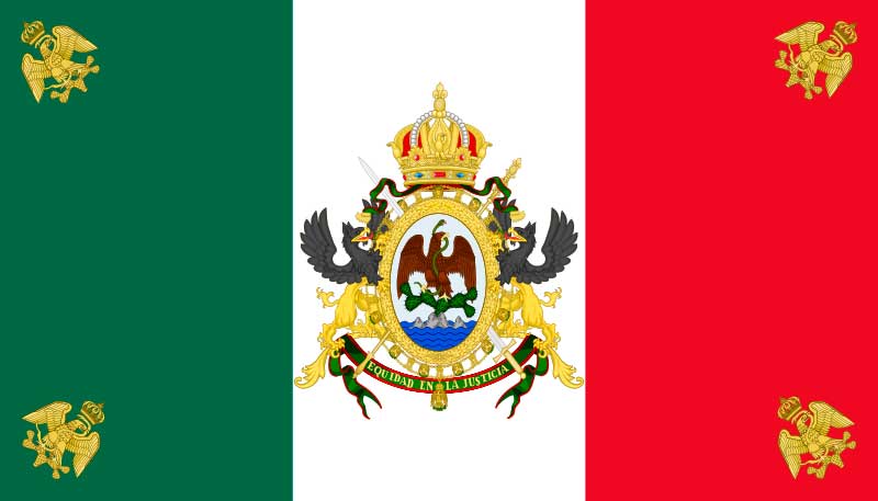 De 1864 a 1867: Tras la caída del sistema republicano y la llegada del emperador Maximiliano de Habsburgo, se cambió drásticamente el escudo asemejándolo al de una monarquía. La bandera fue adornada con escudos de armas de familias europeas.