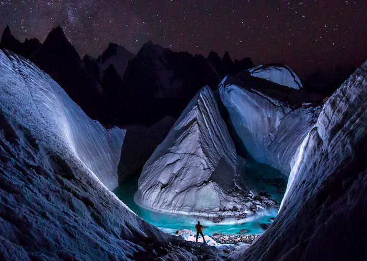 Por ejemplo, gracias a la ayuda de un dron, el fotógrafo David Kaszlikowski capturó una maravillosa escena en la cima de un glaciar, cerca de la montaña K2, la segunda más alta de la Tierra.