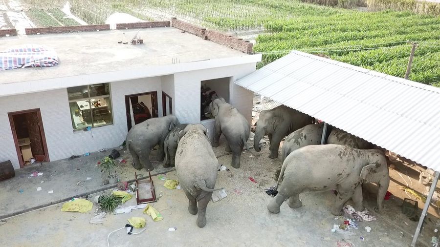 Una manada de 14 elefantes fueron sorprendidos deambulando por la aldea de Manmai, en el condado de Menghai, provincia de Yunnan, China, dijeron autoridades locales.
