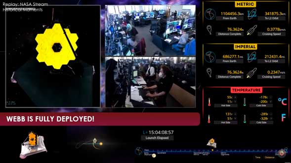 Fue en ese momento cuando gritaron: “Go Webb, go!” (¡Vamos Webb, vamos!) Cabe destacar las virtudes excepcionales de las transmisiones en vivo de la NASA mediante redes, y a través de las cuales pudimos acompañar el histórico suceso desde casa. Observamos desde la cámara del cohete mismo el despliegue de algunos paneles solares. El resto de la observación son modelos simulados en computadora conforme avanza el programa, pero que nos da una idea muy clara del proceso mismo, además de muy bien explicado por la NASA. Todo quedó grabado para la historia, para quienes la curiosidad les mueva a revisarlos posteriormente.