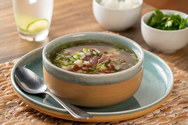 Sirve en un plato hondo y acompaña con cebolla y cilantro fresco.