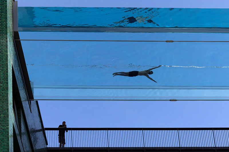 Desde la Sky Pool, los nadadores poseen vistas a la Embajada de Estados Unidos, el río Támesis y los edificios de Londres. Si miran hacia abajo, verán la calle a 35 metros de altura.