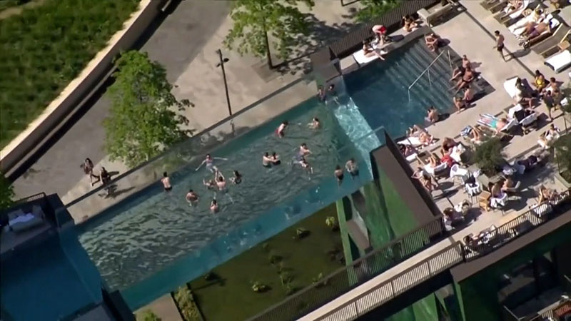 Swimmers enjoy warm weather in London at the Sky Pool which is believed to be the world’s first transparent pool built between two skyscrapers https://t.co/mtRX8qvt0apic.twitter.com/2skTGK9Jp7