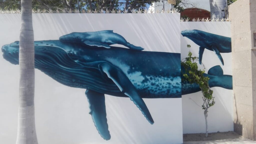 Las paredes de una propiedad en Bahía de Kino muestran las imágenes de ballenas jorobadas en un mural que da vida y embellece a este sector.