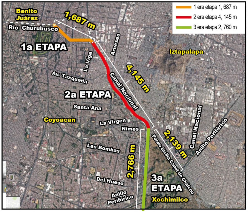 1ra Etapa 2019: La Viga – Río Churubusco / 1,687m 2da Etapa 2020: Nimes – La Viga / 4,145 m 3ra Etapa 2021: Anillo Periférico – Nimes / 2,766m