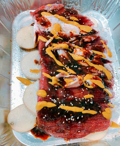 Si tienes tiempo puedes crear una salsa (al final de la receta encuentras la receta salsa para marinar), pero si buscar hacerlo rápido, solo añade los condimentos sobre la carne:Al gusto: salsa de soya, ajo molido, sazonador de carne, ajonjolí, azúcar mascabada, mostaza, miel de abeja, limón , mantequilla derretida y por ultimo el perejil.-EL ORDEN DE OS FACTORES SÍ ALTERA EL PRODUCTO-–