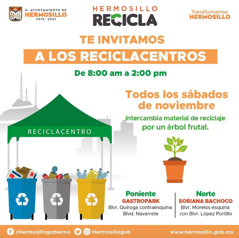 Los Reciclacentros donde se realiza el trueque para conseguir los más de 2 mil 500 árboles frutales disponibles, están ubicados en Gastropark, al poniente de Hermosillo y Soriana Bachoco, al norte de la ciudad; de 8 de la mañana a 2 de la tarde, cada sábado de lo que resta de noviembre y diciembre.