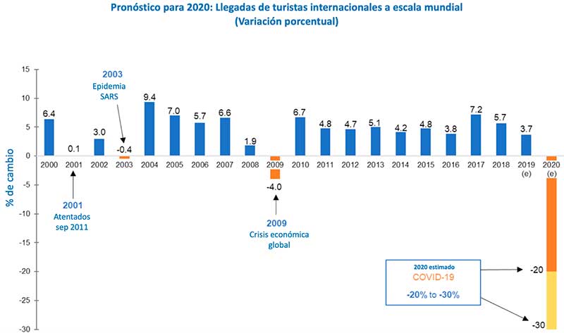 El turismo es una de las actividades mayormente afectadas por las medidas de aislamiento a las que se ha tenido que someter la población en aras de cuidar su salud y evitar aún más contagios, pues se basa en la interacción y la movilidad. A escala mundial, la Organización Mundial de Turismo (OMT) ha señalado que las llegadas de turistas internacionales podrían reducirse entre 20 y 30%, lo cual implicaría pérdidas de entre 300 y 450 mil millones de dólares en ingresos por turismo internacional, algo nunca antes visto.